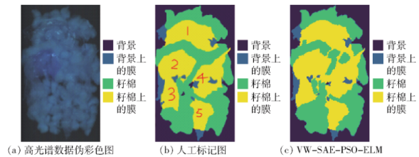 图12 高光谱成像仪在籽棉分选的应用;(a) 人工标记;(b) 高光谱成像仪识别结果